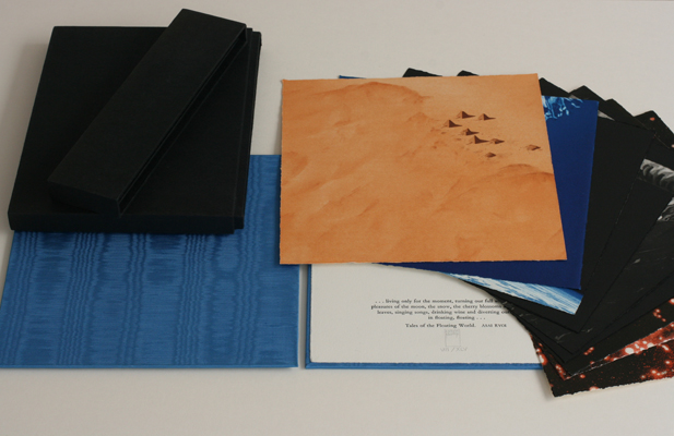 Boxed portofolio of 5 images: colour aquatints printed borderless over 9 sheets. Slip case and moire silk end boards. 260 x 260 x 22 mm. 19 copies extant